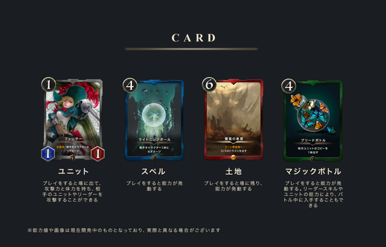 カードの種類:「ユニット」「スペル」「土地」「マジックボトル」