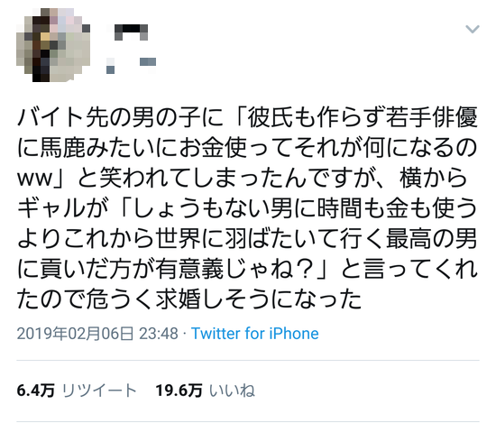 実際は不細工でまわりの男に相手されないからジャニーズとか俳優に逃げるんやけどな