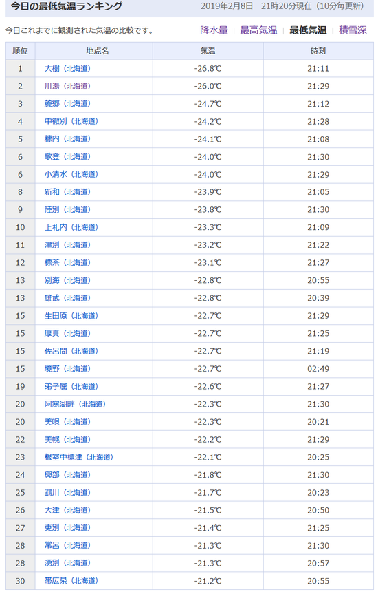 9 北海道 上川地方 下川 -36.1 1978年2月17日