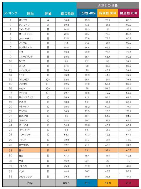 日本は34か国中29位(同48.2)と下位にとどまった。