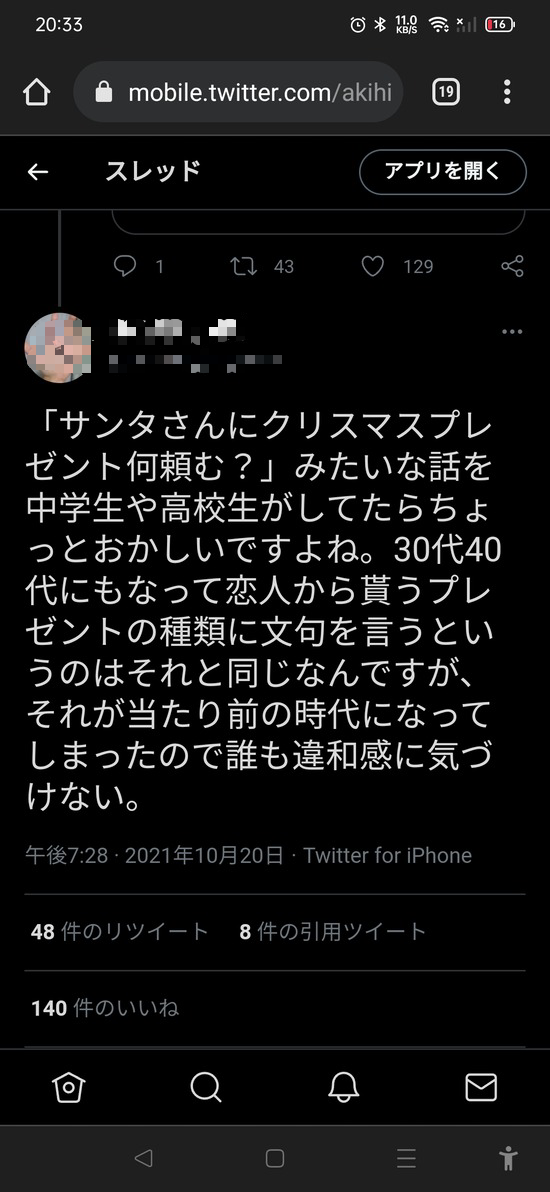 >>2 「サンタさんにクリスマスプレゼント何頼む?」みたいな話を中坊や高校生がしてたらちょっとおかしいですよね。30代40代にもなって恋人から貰うプレゼントの種類に文句を言うというのはそれと同じなんですが、それが当たり前の時代になってしまったので誰も違和感に気づけない。