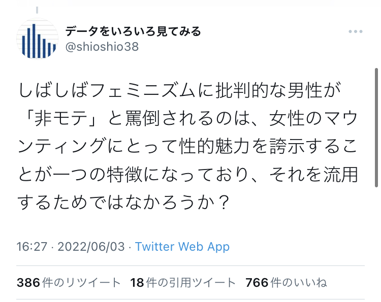 ?こんなこと言ってる奴を調べると女と付き合ったことがないとか、韓国や中国から日本を守る愛国主義者ですとか、アニメの○○ちゃん推しwwみたいな奴だとか大体非モテな奴が多いのは実感としてあるな