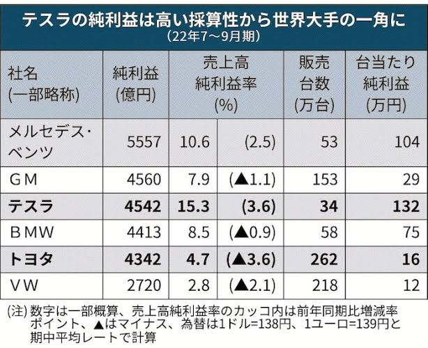 テスラとブランド持ってるメルセデスとBMが利益率高いとしか読み取れないんだが