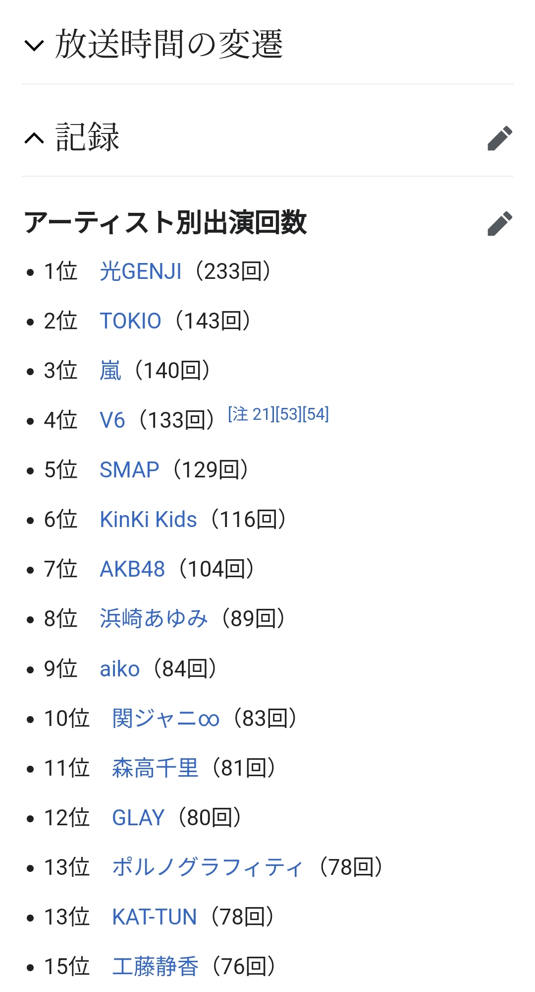 Mステのwikiにアーティスト別出演回数あるから見てみビビるで