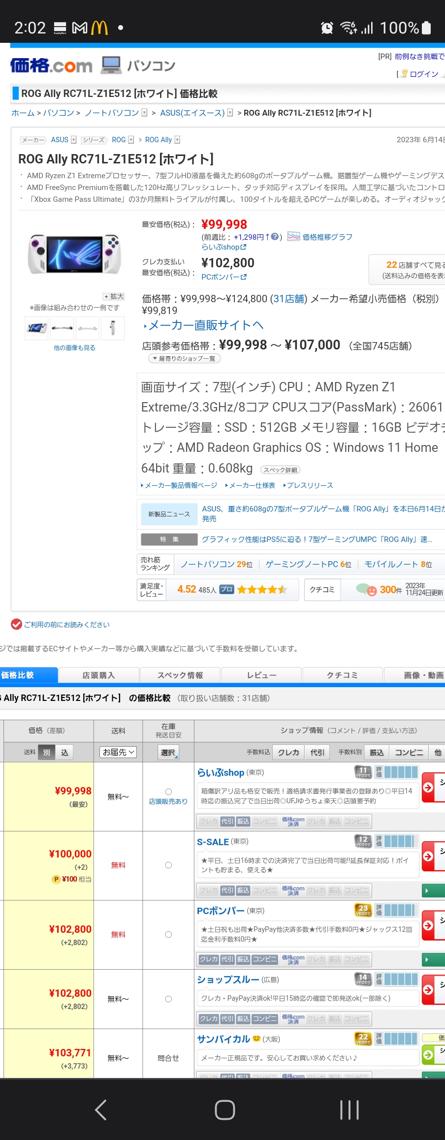 そのほかの仕様は、CPUがRyzen Z1 Extreme、メモリが16GB(LPDDR5X-7500)、