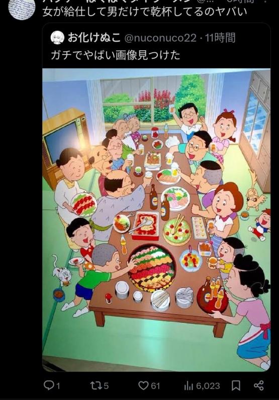 キャバレーとか行ったことなさそう。客の相手は女で運んでくるウエイターは男だぞ。今回と同じ構図だ。これもおんなじでお客をおもてなしするのは家長である夫で男、運んでくるのは妻である女。協力してゲストをおもてなししているのだ