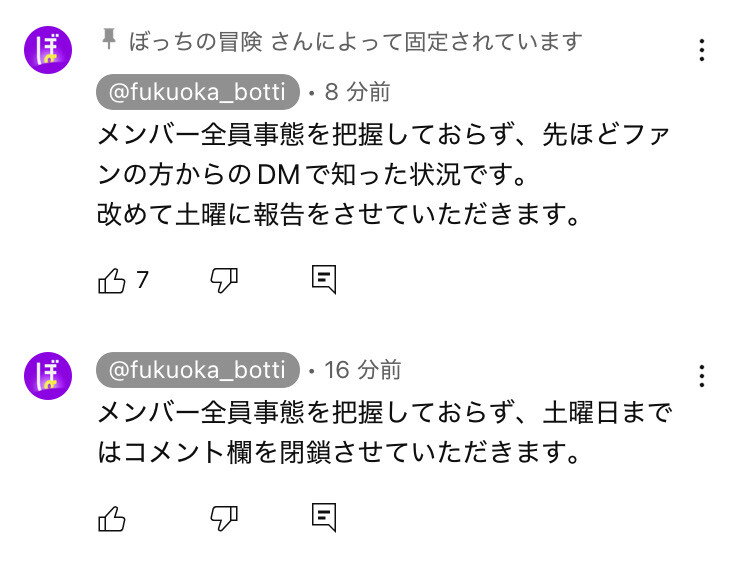 メンバー全員事態を把握しておらず、先ほどファンの方からのDMで知った状況です。