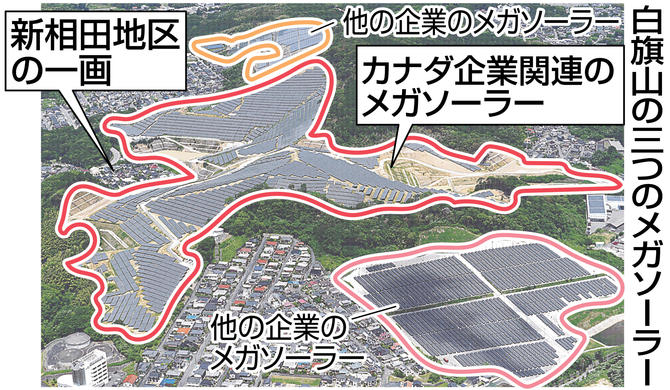 福岡県飯塚市の白しら旗はた山(標高約160メートル、約150ヘクタール)の裾野に広がる新しん相あい田だ地区。パネルに囲まれて暮らしているのは、約50世帯100人。元々は森林に囲まれた宅地だった。2014年に大規模太陽光発電所(メガソーラー)の開発計画が持ち上がって19年末に着工され、今春ほぼ完成した。