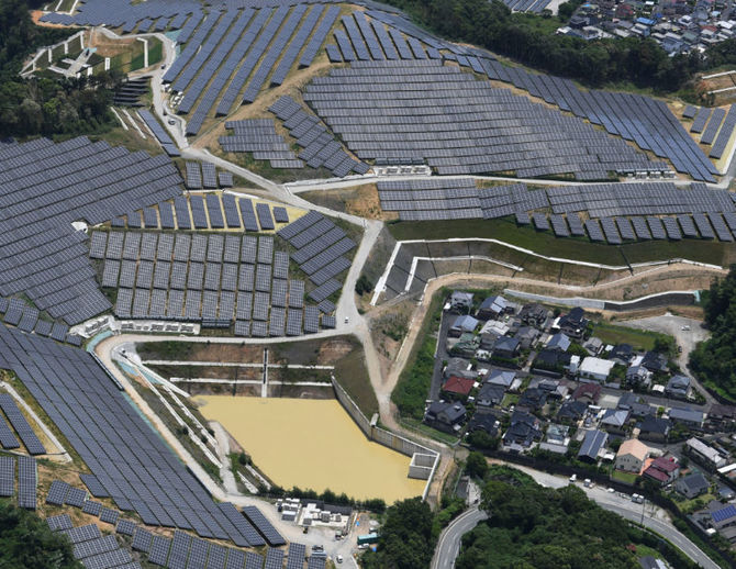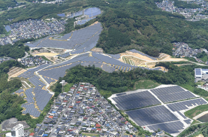 土がむき出しの斜面に約5万4000枚(総出力2万1600キロワット)もの太陽光パネルが並び、住宅地を取り囲んでいる。