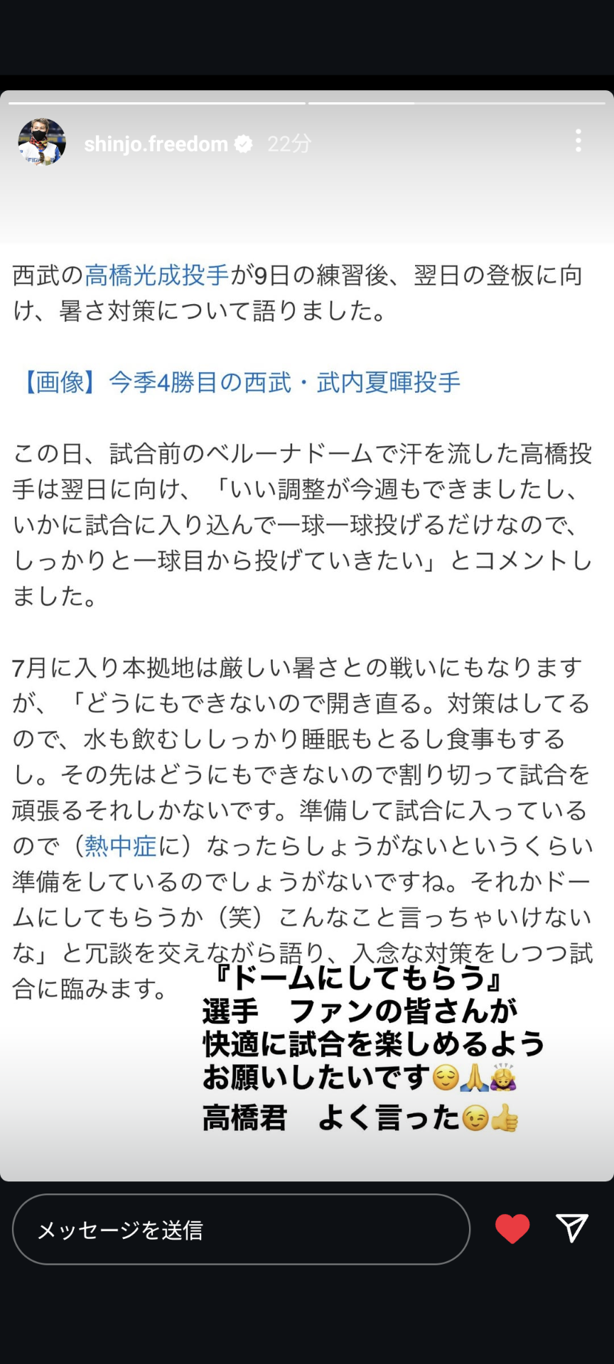 ナイトゲームとは言え球場の温度が43度あった神宮で7回無失点に抑えたデュプランティエが6月頭のベルーナドームでフラフラになってたぞ