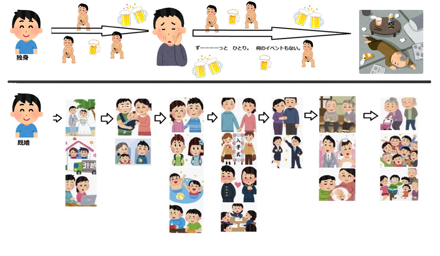 ワシ、独身なのに下のイラストの人生(´・ω・`)