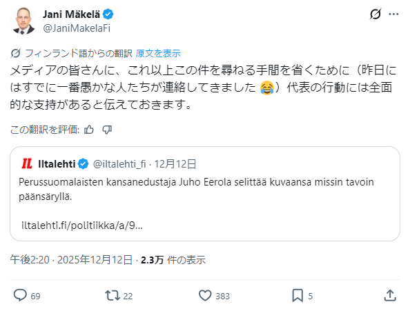 んでフィン人党の国会議員団長ヤニマケラは「彼らの行為を人種差別と解釈することはできない」と述べxではIltalehtiの記事を引用し彼らの行動には党内の全面的な支持があるとした