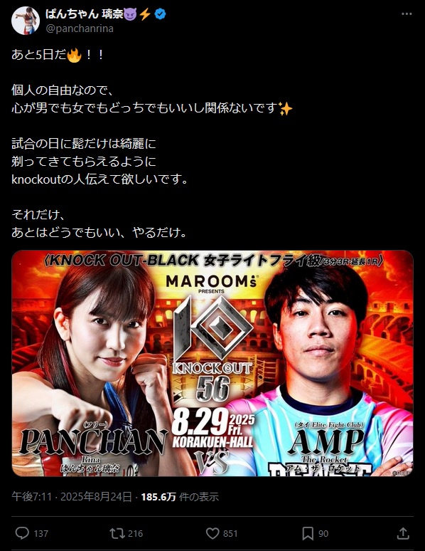 アムザロケットはムエタイ時代に髪が邪魔という理由で短髪にしたり女捨てる程の格闘技ガチ勢なだけで正真正銘の女や