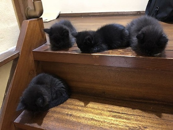 この写真は、しっぽの先だけ白い黒猫ぽいちゃんの飼い主さん(通称ぽい主さん)の妹さんが撮影した写真。階段を下りようとしている真っ黒子猫4匹の姿が映し出されています。1匹は1段下に下りられましたが、後の3匹は段の手前で止まっています。中には下りようかどうしようかと思っているうちに寝てしまった子も……。